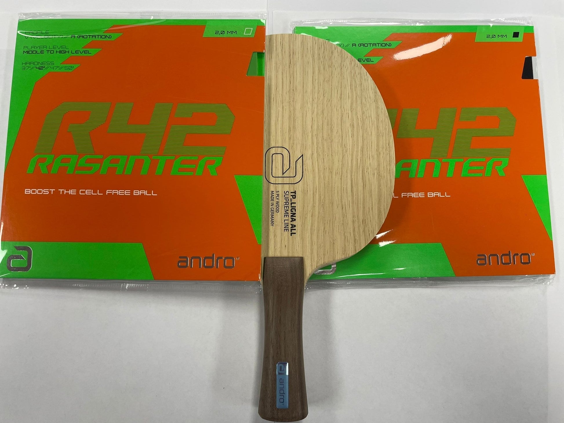 Auf der Vor- und Rückhand ist der Rasanter R42 von andro. Die Belagfarbe kann geändert werden.